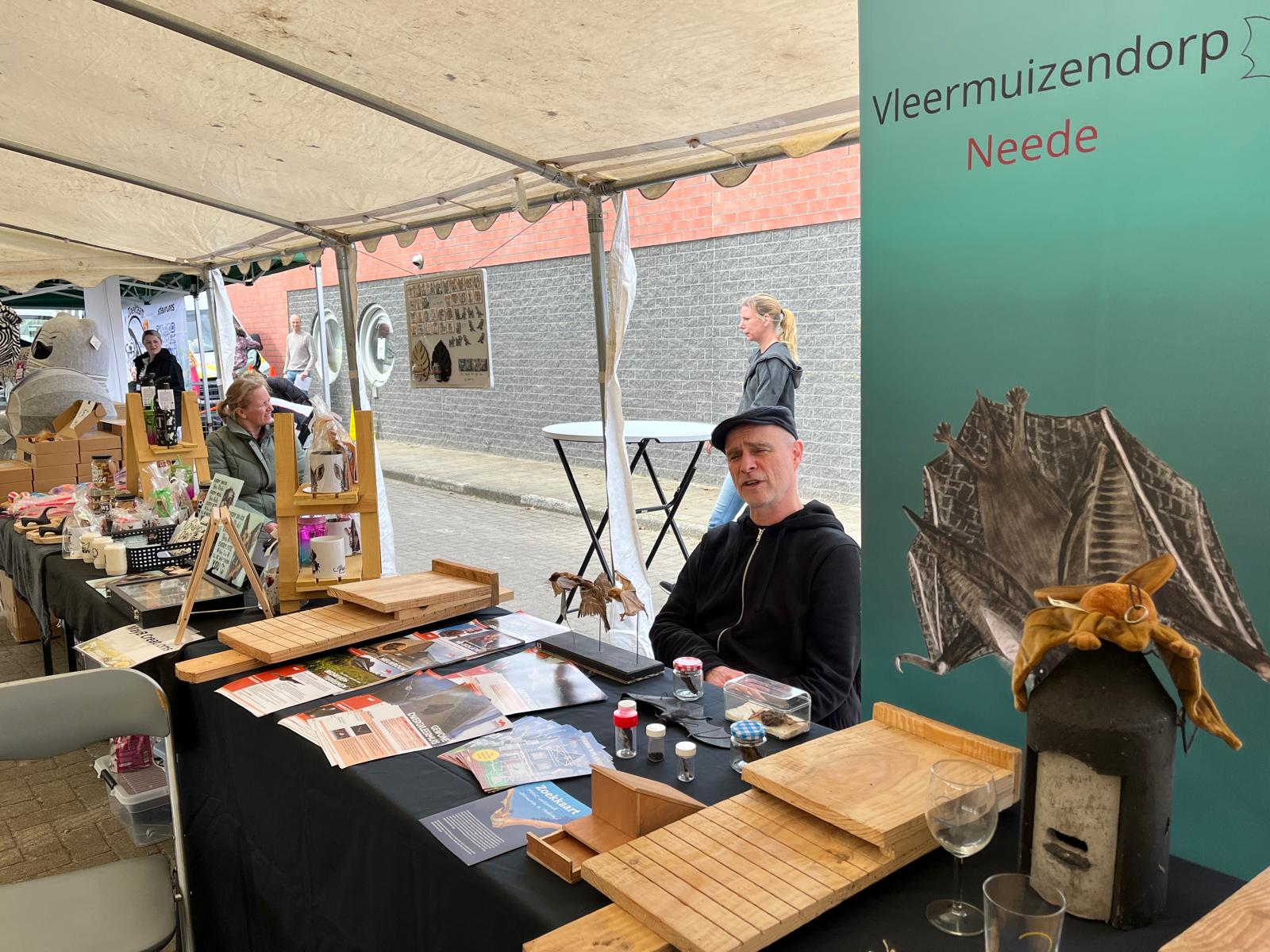 Om 10.30 uur (18 april 2026) stonden wij er met ons materiaal om een kraam te versieren met al het moois dat wij wat betreft vleermuizen hebben. Een groot voordeel is onze koffer op wieltjes: openklappen en binnen de kortste keren was onze kraam voorzien van flyers, vleermuisglazen en zelfgemaakte houten vleermuizen.