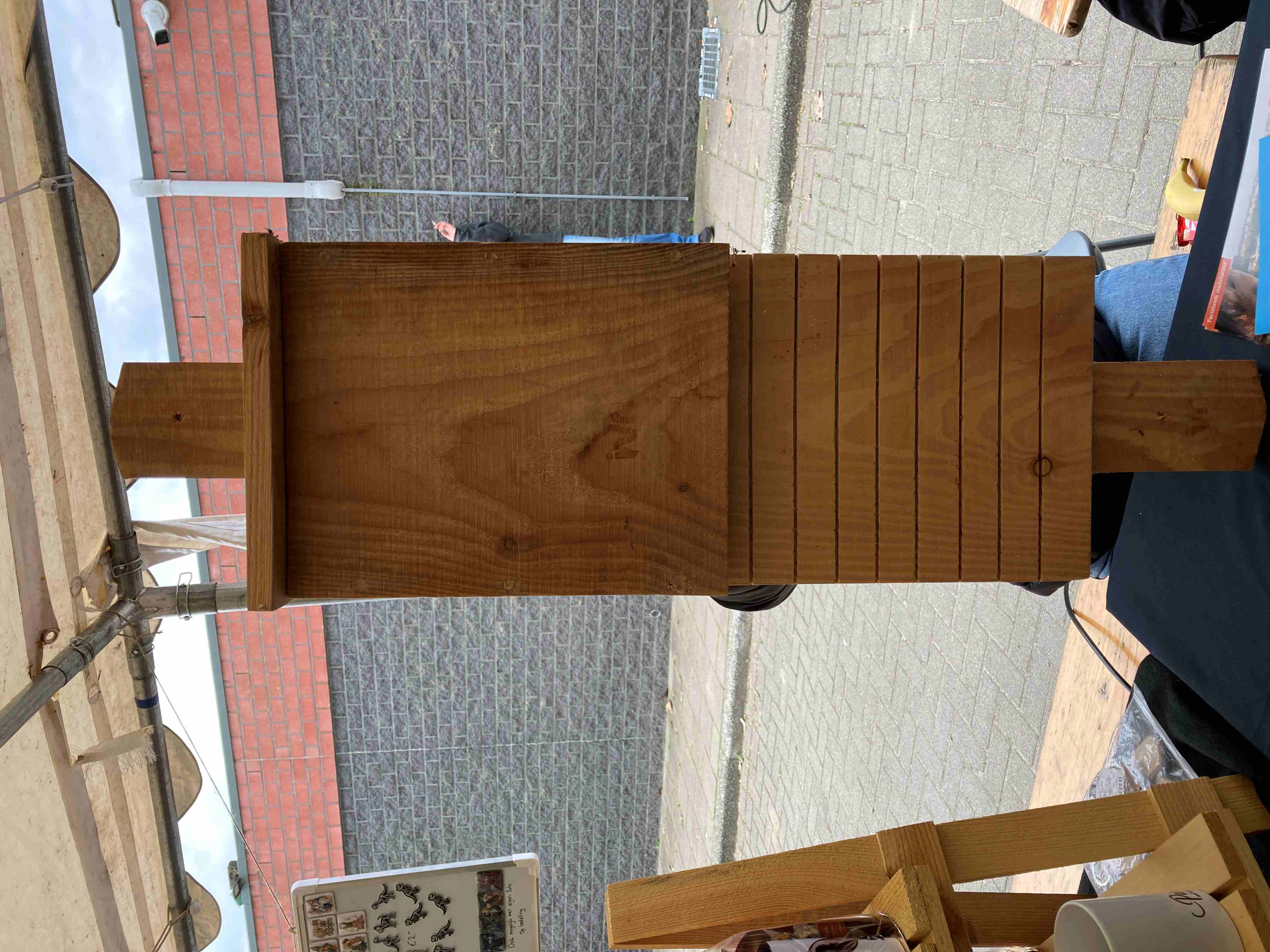 Het was een frisse dag, dus zitten achter onze kraam was niet voldoende om warm te blijven. Wij trokken eropuit om andere kraampjes te bezoeken en mensen te spreken. Naast ons stond een kraam van een mijnheer die uit metalen afvalonderdelen van heftrucks de meest prachtige kunstwerken wist te maken, terwijl tegenover ons iemand zat die nestkastjes maakte waarbij geen twee hetzelfde waren. Toch wel anders dan de standaardkasten die je in de winkel kunt kopen. Maar of vogels hierop hun keuze baseren, is ons onbekend.